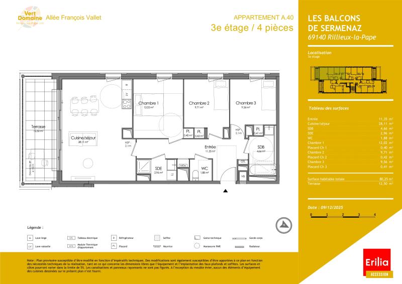 Cet appartement orienté Sud-Est bénéficie d'une terrasse de 12,5 m2 et d'une cave de 5,45 m2.