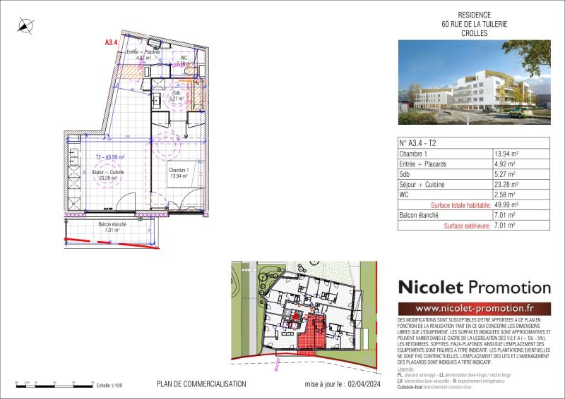 Sur la commune de Crolles, dans une résidence neuve, nous vous proposons à la location, un appartement de type 2 de 49m² avec balcon au 3è étage avec ascenseur. Il est composé d'une cuisine ouverte sur séjour, d’1 chambre avec dressing, salle de bain et WC.