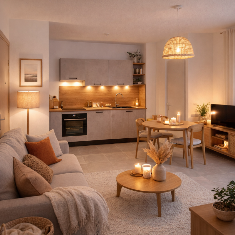 Ce logement est composé d'un séjour lumineux avec accès direct à un jardin privatif, d'une chambre équipée avec un grand placard, ainsi que d'une salle de bain équipée d'un sèche serviette, et de WC séparés.