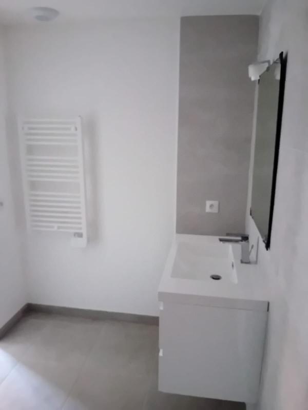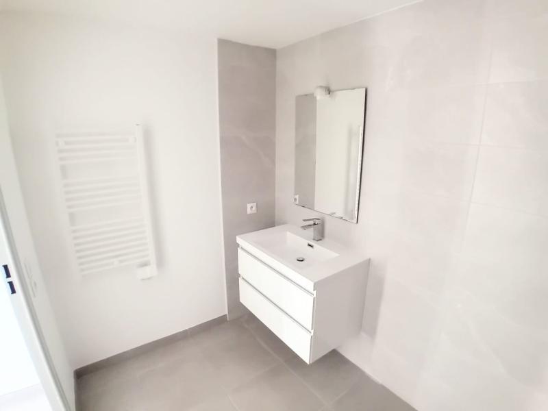 - Salle de bains faïencée toute hauteur et équipée d’un sèche serviette,