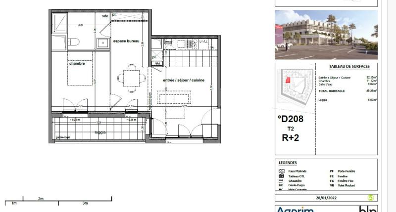 Entrée donnant sur le séjour salon-cuisine aménagée, espace bureau ou autre et un chambre, salle d'eau avec wc et une loggia complète le logement.