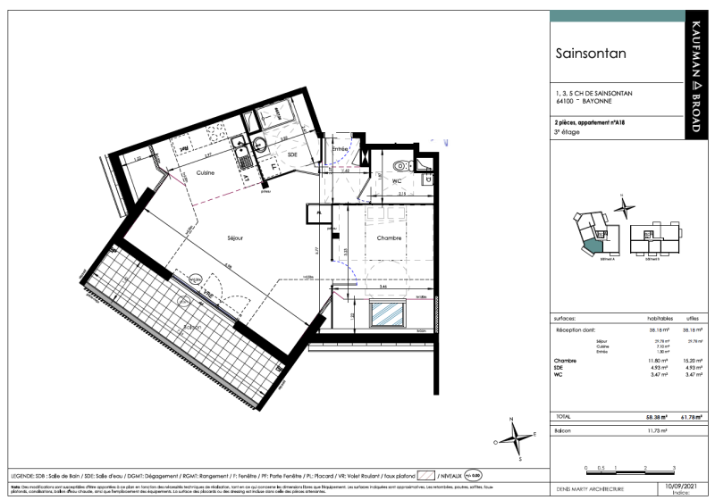 Situé dans une résidence récente à Bayonne T2 de 58m2. Cet appartement est situé au troisième étage, il est composé comme suit : pièce de vie avec cuisine ouverte (équipée de meubles haut et bas et plan de travail), 1 chambre, une salle d'eau, un WC séparé. Le plus de ce logement un balcon de 11m².