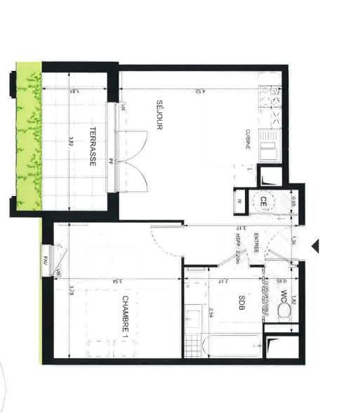 Le logement se compose : d’un coin cuisine ouverte, d'une chambre, d’une salle de bain, d’un WC séparé, et d’une terrasse.