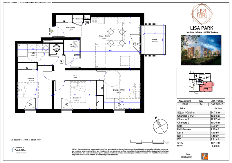 L'appartement se compose d'une entrée, de deux dégagements, d'un WC indépendant, d'une salle d'eau moderne, de trois chambres dont une chambre adaptée aux personnes à mobilité réduite (PMR), ainsi qu'un séjour avec cuisine ouverte donnant sur le balcon. Ce dernier donne directement accès à un balcon de 5,24 m², parfait pour profiter de l'extérieur en toute tranquillité.