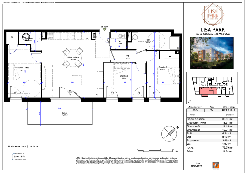 L'appartement se compose d'un dégagement, une buanderie, d'un WC indépendant, d'une salle d'eau moderne, de trois chambres dont une chambre adaptée aux personnes à mobilité réduite (PMR), ainsi qu'un séjour avec cuisine ouverte donnant sur le balcon de 11,24m².